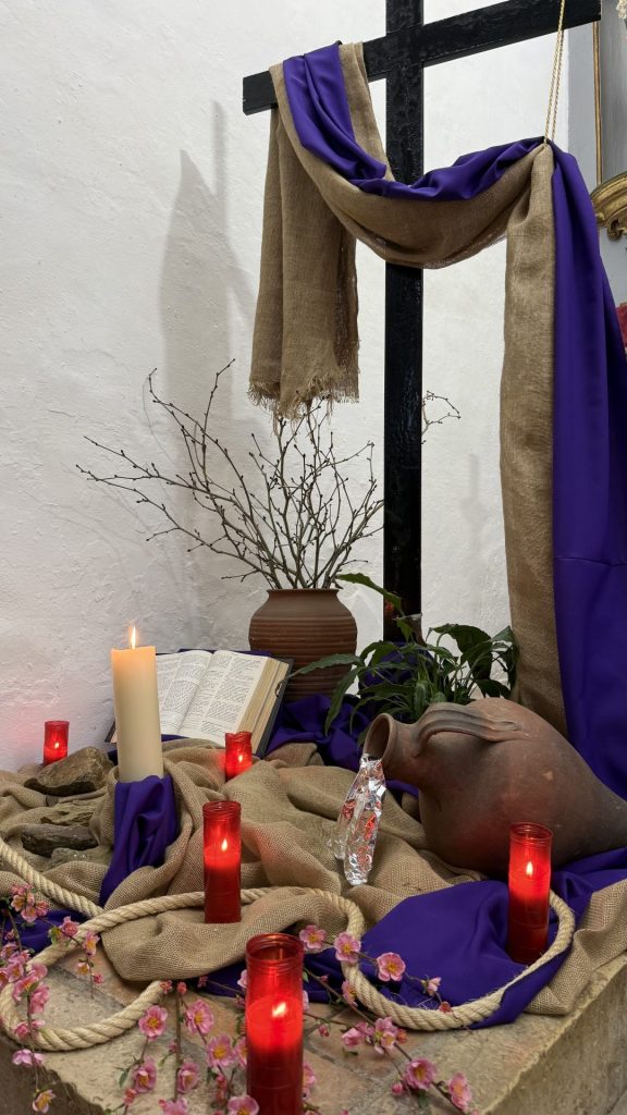 No altar, encontrava-se uma Cruz de madeira, da qual partia uma faixa roxa sobre serrapilheira, símbolo do caminho penitencial que fomos chamados a trilhar. Em cada domingo, novos elementos foram sendo acrescentados, ajudando a visualizar e a viver, de forma concreta, este itinerário de fé.