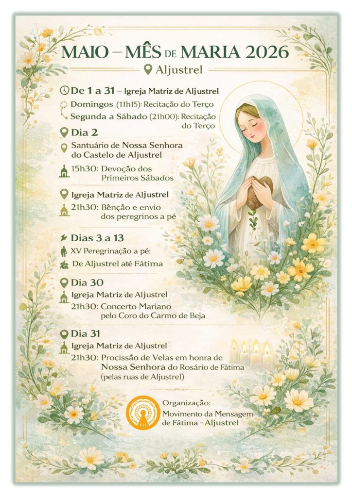 É com grande alegria, que a Paróquia de Aljustrel convida todos a viverem intensamente o Mês de Maria, um tempo de graça, ternura e encontro com a nossa Mãe.